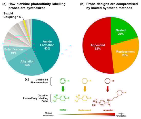 The method of synthesis and mode of incorporation of DAZ probes based on a survey of literature, including 212 published DAZ photolabelled probes. (a) The percentage distribution of common synthetic methods of attachment of the DAZ containing moiety to the probe. (b) The percentage distribution of the three categories of incorporation of DAZs (appended, replacement, nested). (c) A schematic representation of the three categories of DAZ incorporation and the corresponding level of perturbation caused (adapted from Ichiishi et al., 2019 []).