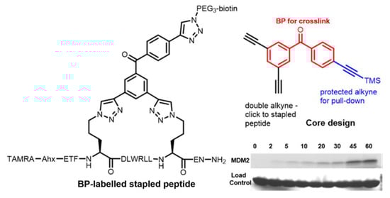 In this study, the probe was attached to the peptide via Cu-catalyzed click chemistry using the double alkyne moieties, to crosslink two different amino-acid residues of the peptide and create an α-helix stabilized by the BP-containing synthetic brace (commonly referred to as stapling). Subsequent irradiation at 365 nm allowed for crosslinking to interacting proteins in proximity, giving insight into protein-interacting partners of the peptide (Figure 7). Following crosslinking, the third alkyne handle allowed subsequent Cu-mediated click chemistry for sample enrichment with biotin. Subsequently, pulldown and proteomic mass spectrometry (MS) analysis was used to identify the target proteins.