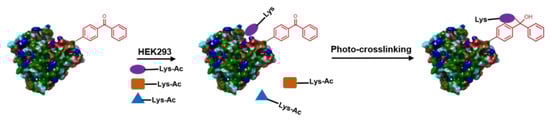 Substrate identification for enzymes provides key information on their cellular roles and mechanisms. PL approaches are one of the most widely applied techniques for identifying and validating new substrates for enzymes. Histone deacetylases are a protein family that enzymatically deacetylate lysine residues mediating a cascade of cellular remodeling that ends in suppression of gene transcription [,]. Histones were initially thought to be the only substrates HDACs act on, but a series of proteomic studies have elucidated and validated other HDAC substrates. Lopez et al. [] were able to use a BP-mediated crosslinking technique to map proteomic interactions of one of the clinically relevant HDACs, HDAC8, in cell lysate, and identified an unbiased subset of substrates. Site-directed mutagenesis was used to incorporate BP at I94, Y100, and F191 in the HDAC8 plasmid. The plasmid was expressed using bacterial culture to obtain the mutant HDAC8, which was then subjected to an HDAC8 activity assay which validated that the mutant enzyme’s catalytic property was intact []. This mutant HDAC8 was then incubated in HEK293 cell lysate and UV-irradiated for 30 mins to probe for its interacting partners. The crosslinked samples were enriched and extracted using an affinity column, and then analyzed by MS to reveal crosslinked partners (Figure 9). This approach is simple and could reasonably be adapted to several proteins and biomolecules of choice.