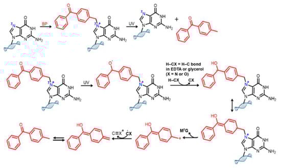 PL techniques based on BP-mediated photoactivation formation remain attractive due to their easy incorporation, minimal effects on biological processes, simple and non-invasive designs, and the ability to control their timing and location of activation which makes them suitable for a host of studies. As such, BPs have been applied to studies outside the realm of protein profiling. Photo-caging, like protecting groups, is one such application involving the masking of an interacting site on a biomolecule such that time-specific irradiation cleaves the PCG and allows restoration of function and activity []. Methylation of C7 on guanine (m7G) is the most observed nucleoside modification, mediating the functions and interactions of several nucleic acids, and understanding the molecular interactions that require this modification is highly desirable. Anhäuser et al. [] recently reported a photocaged m7G using BP and they observed light-controlled uncaging, a feature that has the potential to facilitate new studies of molecular interactions of m7G and m1A (methylated adenine) and could enable the control of biological functions using light [,]. They proposed an uncaging mechanism that is driven by the protonated N7 and involves the biradical BP species abstracting hydrogen and transferring a lone radical to nearby chemical groups (EDTA and glycerol were used in this study) to form a trivalent carbon radical, which subsequently tautomerizes, is terminated, and regains aromaticity to form the methyl BP product (Figure 10). This product was proposed based on NMR and UHPLC-MS/MS analysis of the byproducts following irradiation.