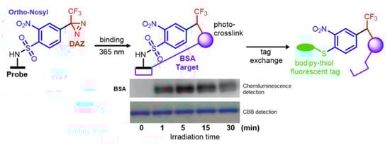 DAZs have been widely used as probes for validating target engagement during the drug discovery process. A simple approach was designed by Saaidin et al. [] that incorporated CF3-diazirine meta to the nitro group on a 2-nitrobenzosulfonamide (ortho-Nosyl) moiety to validate its target. Nosyl groups are excellent protective groups for amines because their deprotection is obtained in high yields following treatment with nucleophilic thiols in an SNAr reaction. The approach in this study is thus useful for elucidating a drug candidate interactome, as most feature secondary amines that can afford easy installation of this PCG. Saaidin et al. installed this ortho-Nosyl-DAZ probe onto biotin for target validation, using bovine serum albumin (BSA) protein, a known biotin target, as an example. The biotin probe was incubated with BSA, and photoirradiation with 365 nm light (250 W) allowed detection of the BSA photoproduct via SDS-PAGE chemiluminescence method (Figure 11). Further treatment of this photolabelled BSA with bodipy-thiol allowed over 70% cleavage of the model compound via an SNAr approach, and this allowed enrichment of photolabelled complexes for easier detection and identification. The authors claim that this method may be a simple approach in PL procedures that can be used to identify a probe’s interactome. This was a proof-of-concept approach which only highlighted the utility of DAZ-mediated crosslinking approaches to determine biological targets.