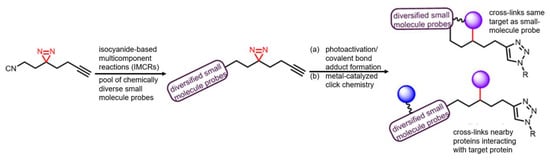 One possible limitation of the approaches described above is in the sheer size of the appendage groups, which may result in disruption of the probe’s function. Several methods thus require simple linkers that can facilitate similar studies with minimal disturbance of native activity. Jackson et al. [] described a bifunctional isocyanide probe incorporating a DAZ group for target biomolecule capture and an aliphatic alkyne that allowed enrichment of photolabelled products via metal-catalyzed click chemistry. The isocyanide group permitted isocyanide-based multicomponent reactions (IMCR) that allowed installation of different small-molecule probes with diverse chemical scaffolds containing at least one aldehyde, amine, ketone, or carboxylic acid functionality (Figure 12). This approach thus introduced the added advantage of performing concurrent fragment-based screening and proteomic exploration under the same assay conditions. The outcome of this work was a clickable photoreactive isocyanide tool that is suited for combinatorial chemistry of IMCR fragments and can allow chemoproteomic-enabled drug discovery.