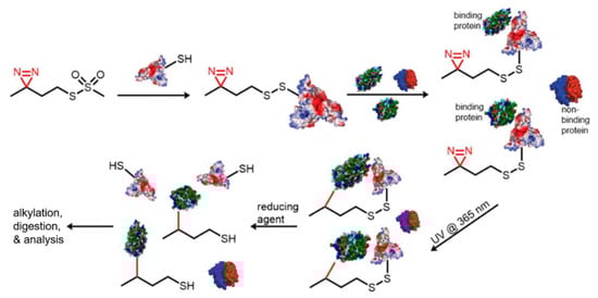 In a simple demonstration of how PL can be used to characterize new PPIs, Horne et al. [] described the use of a DAZ-modified residue in a target protein that crosslinks interacting partners, and subsequent enrichment and MS characterization revealed these binding partners. In this approach, the authors introduced a reactive cysteine into the target protein to allow future incorporation of a disulfide bridge through a methanethiosulfonate (MTS) installed on the DAZ probe. On exposure to a pool of possible targets and subsequent irradiation of UV light at 365 nm, a crosslink was formed with binding proteins, treatment with reducing agents cleaved the disulfide bonds, and only the binding protein was retained (Figure 14).