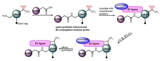 A further extension of this approach was used to investigate the more complicated cellular protein machinery that regulates post-translational modifications such as SUMOylation, ubiquitination, and other ubiquitin-like (Ubl) modifications. The specific networking interactions of E1-activating and E2-conjugating enzymes combined with E3 ligases are modulated by several PTMs and cellular triggers that make their investigation somewhat challenging. Although the use of ABPP is a powerful tool that has been extensively used to study the specific interactomes and pathways of these PPIs [,,,,], this method is limited to E3 ligases, which have a catalytic cysteine that is able to accept Ub/Ubl from the E2-conjugating enzyme and transfer them to the proteins present in their social network. The majority of E3 ligases, however, lack a reactive cysteine that can facilitate Ub/Ubl transfer and are reliant on transient non-covalent interactions to carry out their ubiquitination roles. To successfully investigate the vast abundance of Ub/Ubl-E2-E3 interactions that were excluded by the ABPP approach, Zhang et al. [] constructed a trifunctional E2-conjugating enzyme probe that used an amide bond to link the SUMO-UBc9 (an E2-conjugating enzyme) system, which is known to have incredible affinity for E3 ligase. By functionalizing the Ubc9 with DAZ and photoactivation at 365 nm, any E3 ligase recruited is crosslinked covalently to form a SUMO-E2-E3 ternary complex (Figure 15). This approach should allow the validation of known E3 ligases and the discovery of novel E3 ligases hitherto unreported and should provide a strategy for the construction of other E2-Ub/Ubl conjugation frameworks.