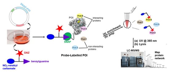 - McCutcheon, D.C.; Lee, G.; Carlos, A.; Montgomery, J.E.; Moellering, R.E. Photoproximity Profiling of Protein-Protein Interactions in Cells. J. Am. Chem. Soc. 2020, 142, 146–153. [Google Scholar] [CrossRef]