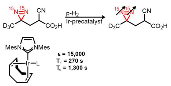 - Shen, K.; Logan, A.W.J.W.J.; Colell, J.F.P.F.P.; Bae, J.; Ortiz, G.X.X.; Theis, T.; Warren, W.S.S.; Malcolmson, S.J.J.; Wang, Q. Diazirines as Potential Molecular Imaging Tags: Probing the Requirements for Efficient and Long-Lived SABRE-Induced Hyperpolarization. Angew. Chem. Int. Ed. 2017, 56, 12112–12116. [Google Scholar] [CrossRef] [PubMed]