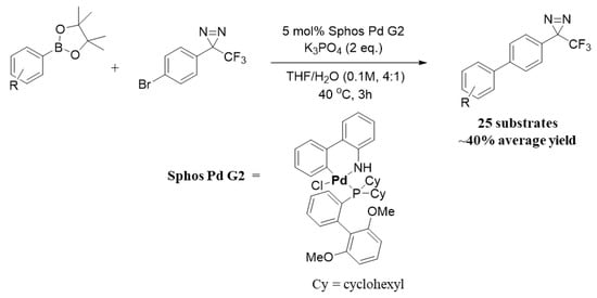 In 2019 Merck and Co. published a study addressing this limitation in probe design by developing a Suzuki–Miyaura cross-coupling reaction that is compatible with TPD []. Suzuki–Miyaura cross-coupling screens of 8-haloquinolines with phenylboronic acid and boronic ester derivatives combined with varying reaction conditions such as temperature, palladium catalyst, solvents, and bases, in the presence of DAZ-containing spectator molecules, were used to determine the most DAZ-friendly cross-coupling conditions that gave the highest yields. After the identification of the most suitable cross-coupling conditions (least harmful to DAZs and producing the greatest yields), the substrate scope of the reaction of a TPD derivative (DAZ-containing aryl bromide (3-(4-bromophenyl)-3-(trifluoromethyl)-3H-diazirine)) was evaluated with a variety of boronate esters. The results concluded that the average yield was ~40% and that the conditions were compatible with saturated and unsaturated heterocyclic rings and hydrogen bond donors (aromatic amines, alcohols, and amides, Scheme 2). Furthermore, the applicability of cross-coupling conditions beyond the p-bromophenyldiazirine synthon was demonstrated by reproducing similar yields with the m-bromophenyldiazirine synthon. Lastly, an improvement in yield (from 20% to 45%) and reaction time (6 days to 3 h) was reported in the synthesis of known photoaffinity probe GSK-3 [,].