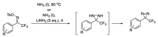 Additionally, Wang et al. developed two methods for synthesizing TPD derivatives in a one-pot synthesis directly from the tosyl oxime without isolating the diaziridine precursor (Scheme 4). Kinetic NMR experiments suggested the reaction to proceed via a diaziridine intermediate which is rapidly formed in situ, and is followed by a gradual oxidation to the diazirine [].