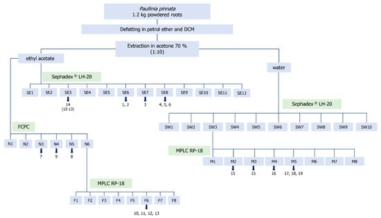 Extraction and fractionation scheme of roots and root extract from Paullinia pinnata.
