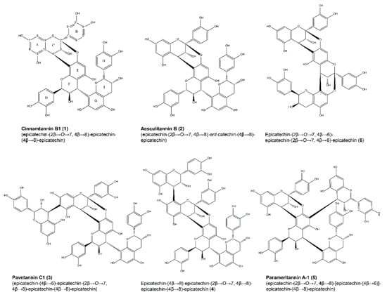 The major oligomeric PACs shown in Figure 2, also representing the major compounds within the EtOAc partition, were subsequently purified by preparative HPLC and identified as the known compounds cinnamtannin B1 (1) [,], aesculitannin B (2) [], pavetannin C1 (3) [], epicatechin-(4β→8)-epicatechin-(2β→O→7, 4β→8)-epicatechin-(4β→8)-epicatechin (4) [] and parameritannin A-1 (5) [].