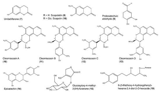- Ray, A.B.; Chattopadhyay, S.K.; Kumar, S.; Konno, C.; Kiso, Y.; Hikino, H. Structures of cleomiscosins, coumarino-lignoids of Cleome viscosa seeds. Tetrahedron 1985, 41, 209–214. [Google Scholar] [CrossRef]