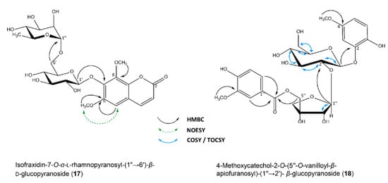 For cmpd. 17 (m/z 531.1775 [M + H]+; C23H31O14) also showing a UV spectrum typical for coumarins, two major fragments were detected: m/z 223.0643 and m/z 309.1214 corresponding to a dimethoxylated hydroxychromene-2-one and a disaccharide resp., of which the disaccharide consisted of a hexose and a desoxyhexose moiety. The respective monosaccharides were preliminarily identified as glucose and rhamnose by TLC after acidic hydrolysis. 1H NMR and COSY spectra showed two proton doublets (δ 7.99, d, H-4 and δ 6.50, d, H-3) and a singlet at δ 7.14 (H-5) without any COSY correlations, belonging to the chromenone residue. All remaining proton signals, including those for the methoxy groups, appeared further upfield (δ 5.14 to 1.00). Long-range correlations from δH 4.05 (3H) to δc 140.40 (C-8) and δH 3.92 (3H) to δc 149.86 (C-6) suggested the two methoxy groups to be linked to the aromatic moiety, however, the singlet proton at δ 7.14 (H-5) showed an HMBC crosspeak only to C-6, but not to C-8. Proximity of H-5 (δ 7.14) to the methoxy group at C-6 (δ 3.92) was confirmed by NOESY correlation, which additionally supported the structure of the coumarin residue to be isofraxidin. 1H and 13C NMR data for 17, 18 and 19 are given in Table 1, key correlations are shown in Figure 4. 1H NMR signals of the respective carbohydrate moieties were distinguished by COSY and TOCSY spectra. The anomeric proton of the glucose moiety (δ 5.14, d, H-1′) correlated to position C-7 (δ 141.07) of the coumarin residue, whereas both protons at position 6′ of the glucose moiety (δ 3.92/3.73) correlated to C-1′′ (δ 101.37) of the rhamnose. A coupling constant of J1,2 7.8 Hz (δ 5.14, d, H-1′) indicated equatorial position of the anomeric hydroxyl group and thus β-configuration of the glucose residue. A distinct three-proton singlet (δ 1.00, H-6′′) which could be assigned to the spin system of the rhamnose moiety by TOCSY data, was indicative for a methyl residue at position C-6′′ and pyranose form of the carbohydrate. This was supported by COSY correlations.