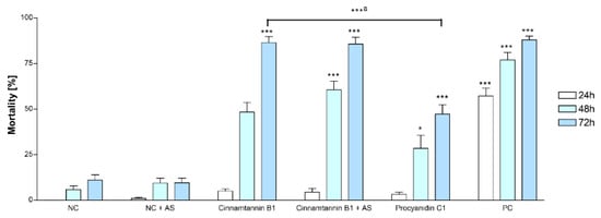 Fortunately, no major side products had formed during the incubation period of 72 h (Supplementary Materials Figure S2) and the addition of ascorbic acid had no impact on the anthelmintic activity of cinnamtannin B1 (1; Figure 6).