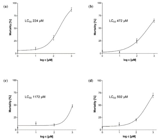 Dose-response curves of tetrameric PACs (a) pavetannin C1 (3), (b) epicatechin-(4β→8)-epicatechin-(2β→O→7, 4β→8)-epicatechin-(4β→8)-epicatechin (4), (c) parameritannin A-1 (5) and (d) cinnamtannin A2. Corresponding LC50 values as obtained by nonlinear regression are given within the respective curve.