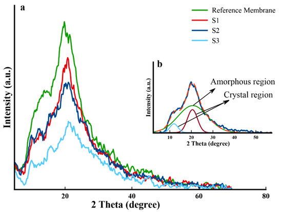 where Ac is the sum of all crystalline peaks areas and Aa is the amorphous peak area. The peak fitting demonstrated an amorphous nature for chitosan. In order to calculate the percentage of the crystallinity of chitosan, three Gaussian peaks were fitted and were determined according to the XRD deconvolution method [37]. The two peaks fitted at ~ 11 ° and ~ 20 ° corresponded to the crystalline structure, while the shoulder fitted at ~ 21 ° appertained to the amorphous phase [38,39]. The obtained crystallinity values for all samples are listed in Table 2, which showed that the relative crystallinity amount of the membrane decreased from 27.7% to 17.3%. Thus, the irradiated samples became more amorphous than the reference membrane, probably due to the scissoring of these bonds and the local movement of free radicals [40].