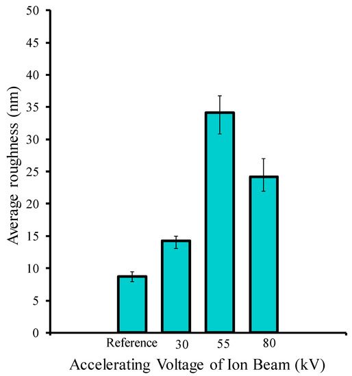 The morphological structures of the reference and irradiated chitosan membranes were studied by AFM as shown in Figure 3, with the details of AFM images for the reference and methane ion-bombarded chitosan, which rendered the surface rougher. The increase in roughness may be due to the methane ion ablation of the surface membrane. The average roughness is depicted in Figure 4. As can be seen, the roughness of the irradiated sample initially increased as compared to the reference sample and then decreased after being irradiated by ions with an accelerating voltage of 55 kV.