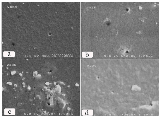 An alternative method of studying polymer surfaces is scanning electron microscopy. Figure 5 represents the FESEM micrographs of the reference and ion bombardment samples, which showed the increased pore sizes of the samples irradiated by ions with an accelerating voltage of 30 kV (Figure 5b). Ion implantation in the membranes induced deposited charges and probably electrostatic repulsion between them, and the inherent cationic charges of the membranes were responsible for the increased pore size. With the increase in the accelerating voltage of ion beams (ion beam with a higher energy) (Figure 5c,d), the surface of chitosan shrank slowly. Thus, the decrease in the pore size of the chitosan membrane may be due to the shrinkage of the surface membrane.