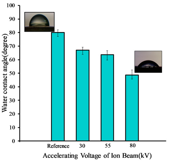 Figure 6. Comparison of the water contact angles of the chitosan membrane (reference sample) and the irradiated chitosan membrane at different accelerating voltages of ion beams.