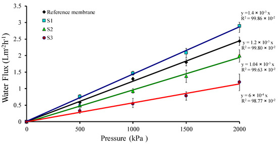 A piece of the membrane with a known area was placed in a dead-end filtration unit, and N2 gas was applied to the unit at varying pressures. A series of water flux (J) and its corresponding pressure (ΔP) were recorded after each period of time. The hydraulic permeability coefficient (Lp) were acquired from the graph slope amongst the flux and the pressure used; the relation was shown as J = Lp ΔP, known as the Hagen–Poiseuille equation [47,48,49]. The water flux (J) across the membrane was predicted and plotted against the used pressure. Figure 7 displays the water flux of the irradiated membranes related to the reference ones and illustrates a linear relationship between the flux and the pressure used for the membranes. Leveneur et al. studied ion implantation and further chemical and structural changes mostly based on a ballistic process. According to the process, the fluence changes lead to different results. Increasing the fluence initiate the degradation of the cellulose and the degradation and breakage of the intermolecular bonds. During ion implantation, the energy carried by the incident ions is deposited within the implantation range. This initially results in high local and transient increase of temperature or thermal spikes. This energy is then transferred through heat conduction to the entire sample. On the other hand, electrostatic repulsion between the cationic fixed charges of the membrane and the deposited charge from the implanted methane ions might cause negligible increase in water flux of samples irradiated with an accelerating voltage of an ion beam (30 kV). The higher value of the severe decline of the water flux is due to the increase in the accelerating voltage of the ion beam, which results in the decrease of the porosity and pore size of the membrane surface. Figure 5 shows the FESEM micrographs of a pore sealant after ion bombardment with the increase in the accelerating voltage of the ion beam due to the shrinkage of the surface membrane. This influenced the whole pore area of the membrane. Table 4 shows hydraulic permeability (Lp) values obtained from the slope of the graph in Figure 7, and the membranes were categorized as reverse osmosis ones [50].