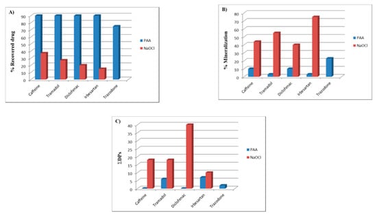 (A) Recovery percentages; (B) % of mineralization; and (C) number of the degradation byproducts of the pollutants considered for treatment with peroxyacetic acid (PAA) and with hypochlorite, respectively.