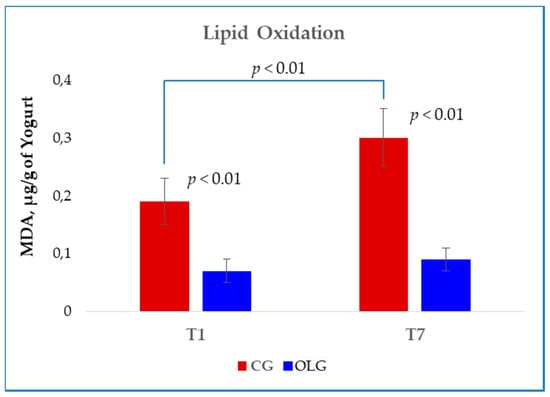 The oxidative process on the lipid component was instead determined by a Thiobarbituric Acid Reactive Species (TBARS) test, both after 1 day (T1) and 7 days (T7) of storage at +4 °C and the results are shown in Figure 1. In T1 samples, the amount of malondialdehyde (MDA) was lower in OLG samples compared with CG samples (p < 0.01). In T7 samples, the same trend was observed, although a marked increase in the difference between CG and OLG samples was found (p < 0.01). By comparing the obtained results on the basis of the storage time (T1 vs. T7), a significant increase in oxidation was evidenced in CG yogurt (p < 0.01), while no variations were induced by the OL dietary enrichment.