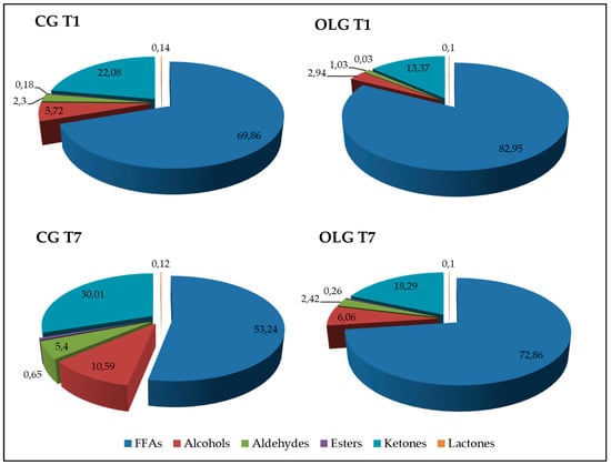 Schematic representation of relative proportions (%) of volatile compound families detected in yogurt samples obtained from goats fed the standard diet (CG) and goat that received the dietary supplementation with olive leaves (OLG). Samples were analyzed after 1 day (T1) and 7 days of storage (T7) at 4 °C. Free fatty acids (FFAs).