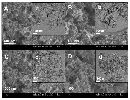 The morphologies of the bovine serum albumin (BSA)–peptide–CaP composites were analyzed using field-emission scanning electron microscopy (FE-SEM) (Figure 1A–D and transmission electron microscopy (TEM) (Figure 1a–d). Thin sheets of particles were observed, where the particle sizes were approximately 200 × 200 nm in length and 10 nm in thickness. In addition, there were no significant differences in the morphologies of the protein–peptide–CaP composites in comparison with CaP containing no protein. In our previous study [29], αpLys–CaP composites were obtained with rod-like morphologies, formed using a similar synthetic procedure to that described in this work. The protein molecules were found to be affected by the morphologies of the sheet-like CaP materials.