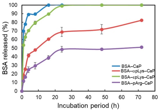 Release profiles, expressed as the percentage of cumulative FITC–BSA released over the course of different incubation periods (2, 4, 6, 8, 16, 24, 48, and 72 h) of the FITC–BSA–peptide–CaP composites.