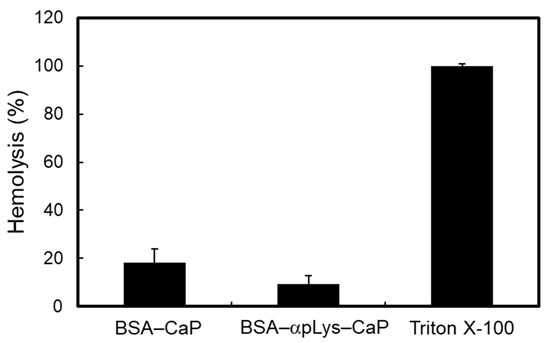 Two composites (BSA–αpLys–CaP and BSA–CaP) were tested for hemocompatibility using rabbit red blood cells (RBC) (Figure 5), where it was found that Triton X-100 (1%) as a positive control led to 100% RBC lysis. These composites induced low hemolysis activity when they were of sufficiently high concentration (2 mg in 1 mL of a 2% RBC suspension), increasing the amount of free hemoglobin from the RBCs present in the supernatant to 18% and 8% at the above concentration, suggesting that the BSA–peptide–CaP composites did not influence the RBC and good hemocompatibility.