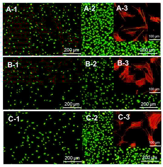 Figure 6 A-1–C-1 show mouse osteoblast-like MC3T3-E1 cell viability and proliferation after 24 h of their co-culturing with the BSA–CaP and BSA–αpLys–CaP composites. The cell densities of both composites were similar after 24 h, suggesting that the protein–peptide–CaP composites did not negatively affect the initial attachment of these cells. The viability and proliferation of these cells were explored using a LIVE/DEAD double staining method, and their cell viability was determined using green staining for living cells and red for dead cells over culturing periods of 24 h, where after this period, no dead cells were observed. Consequently, the cell viability of the long-term co-cultures (72 h) with the composites was perfect (Figure 6A-2–C-2). The cell proliferation rate observed with the BSA–αpLys–CaP composite had a similar cell density (approximately 50,000 cells/cm2) to that of the medium with no added composite used as a positive control (Figure 6). In contrast, as can be seen in Figure 7, the density of cells with the BSA–CaP composite showed approximately 50% decrease in growth compared to those with BSA–αpLys–CaP. Figure 6A-3–C-3 show fluorescence micrographs of actin stress fibers in cells co-cultured with BSA–CaP and BSA–αpLys–CaP. Compared to the medium without any composite used as a positive control, in the other samples, the cultured cells spread in a planar shape and the formation of actin stress fibers with many cell pseudopods was clearly observed inside cells with the BSA–αpLys–CaP composite. As can be seen in Figure 6C-3, actin stress fibers were visible inside elongated shaped cells, however, fewer cell pseudopods formed co-cultures with the non-peptide BSA–CaP composite. These results suggest that cell spreading and proliferation can strongly improve in response to peptide-containing CaP composites. It has been reported that cationic polypeptides such as pArg- and pLys-based materials have high cell penetrating ability and therefore, their inorganic or organic composites are expected to make high performance drug delivery materials [34,35,36].