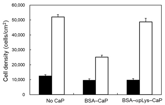 Cell proliferation after culturing for 24 h (black bars) and 72 h (white bars) with the protein–peptide–CaP composites. Cell numbers (density), which are represented as values per unit area, were evaluated using the ImageJ software.