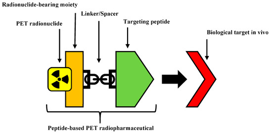 The structure of a peptide-based radiopharmaceutical (Figure 1) typically contains the following components: a peptide to act as the targeting entity, a linker, a radionuclide bearing moiety, and a PET radionuclide. The linker is sometimes an optional component of a radiopharmaceutical that is incorporated to facilitate the conjugation of the targeting peptide and the radionuclide bearing moiety, and/or improve its pharmacokinetics such as by increasing metabolic stability or manipulating biodistribution [8,9,10,11]. The linker can also be used as a spacer to distance bulky portions of a radiopharmaceutical, such as chelators from the bioactive portions, to reduce steric interference and maintain high binding affinity [12].