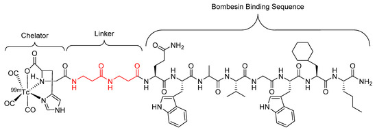Garayoa et al. showed that the incorporation of a β-alanine-β-alanine (βAla-βAla) linker into a human tumor targeting bombesin peptide radiopharmaceutical (Figure 9) resulted in a two-fold increase in metabolic stability against proteolytic degradation and no decrease in receptor affinity when compared to the unmodified structure (sans linker) in studies performed using in vitro tumor cell cultures [81]. However, when the studies were performed in human plasma, the analogue with the βAla–βAla linker showed decreased metabolic stability with a half-life of 10 h compared to 16 h for the unmodified analogue [81].