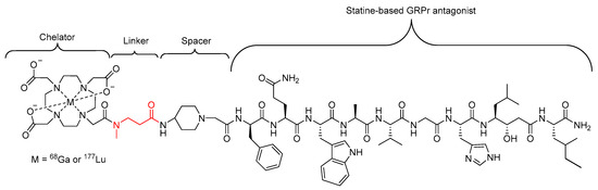 Statine-based GRPr antagonist radiopharmaceutical investigated by Popp et al., with the N-methylated β-alanine linker highlighted in red [82].