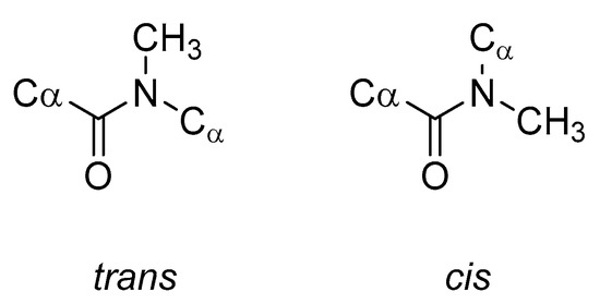 N-Methylation of a peptide backbone replaces a hydrogen bond donor (NH) with a potential steric clash (NCH3), thus eliminating some inter- and intramolecular hydrogen bonds [85,86,87]. N-Methylation can also greatly alter the conformation of the entire peptide. This occurs because the N-methyl group will influence the conformational flexibility of both the peptide backbone and the side chains of the residues close to the N-methyl amino acids. Of particular note, the energy barrier between the trans and cis peptide bond conformations (Figure 14) is greatly reduced and consequently the cis peptide bond conformation becomes readily accessible [88].