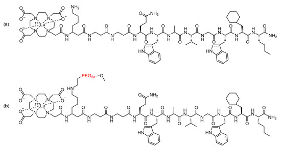 Structure of (a) unmodified and (b) modified bombesin peptide radiotherapeutics investigated by Dapp et al., with the PEG linker modification highlighted in red [109].