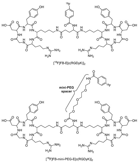 Structures of [18F]FB-E[c(RGDyK)]2 and [18F]FB-mini-PEG-E[c(RGDyK)]2 [110].