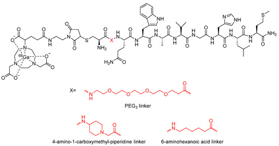 Bombesin-based radiopharmaceuticals investigated by Bacher et al., with the linker location and linkers highlighted in red [113].
