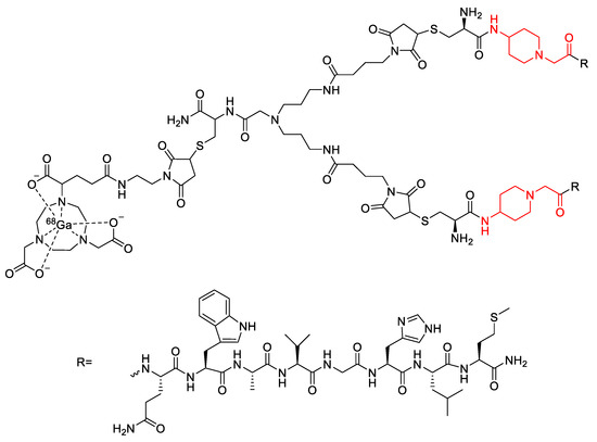 Bombesin-based dimer radiopharmaceutical investigated by Bacher et al., with 4-amino-1-carboxylmethyl-piperidine linkers highlighted in red [113].