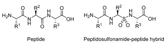 - De Bont, D.B.A.; Sliedregt-Bol, K.M.; Hofmeyer, L.J.F.; Liskamp, R.M.J. Increased stability of peptidesulfonamide peptidomimetics towards protease catalyzed degradation. Bioorg. Med. Chem. 1999, 7, 1043–1047. [Google Scholar] [CrossRef]