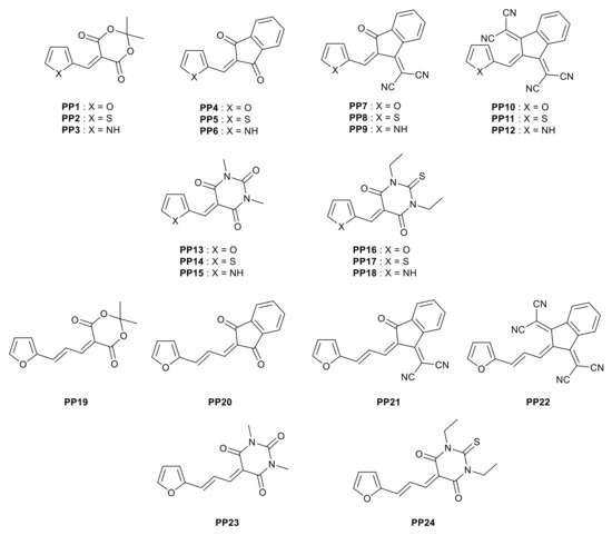 Chemical structures of PP1–PP24 used as precursors for the design of Donor–acceptor Stenhouse adducts (DASA) photoswitches.