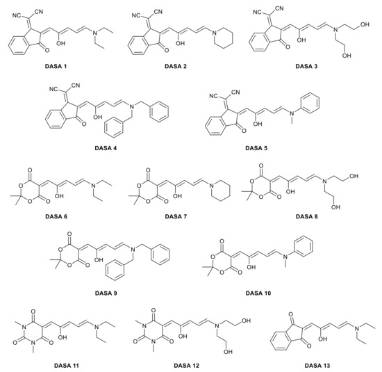 Chemical structures of DASA 1–DASA 13, PP25 and PP26.