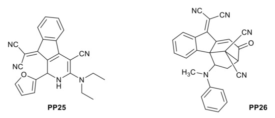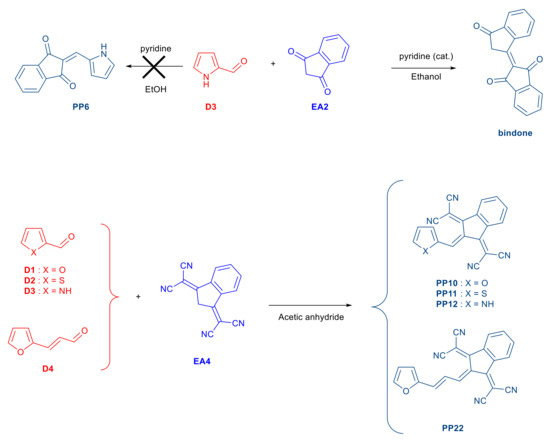 This is directly related to the low reactivity of pyrrole-2-carboxaldehyde D3, favoring the dimerization of indane-1,3-dione EA2. Concerning the synthesis of PP10–PP12 and PP22 with EA4, a completely different synthetic route had to be used due the remarkable stability of the EA4 anion under basic conditions. To overcome this drawback, the Knoevenagel reactions were carried out in acetic anhydride and PP10–PP12 and PP22 could be isolated with reaction yields ranging from 82% to 88% yield (see Scheme 2 and Table 1).