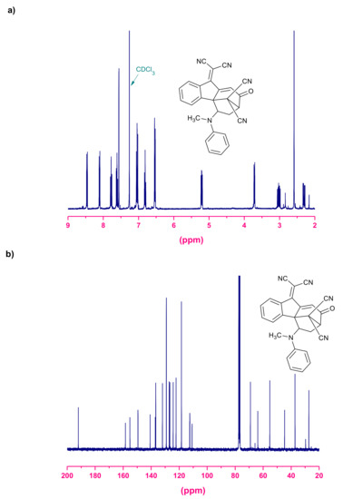 Finally, by slow evaporation of the deuterated solvent in an NMR tube, crystals of PP26 could be obtained and the crystal structure was resolved by X-ray crystallography (see Figure 4). It should be noted that only one of the possible diastereoisomers has been found in the crystals, despite the analysis of several crystals to confirm this point. Based on the crystal structure, the relative stereochemistry of PP26 could be determined as (4R,5R,7S)-10-(dicyanomethylene)-5-(methyl-(phenyl)amino)-8-oxo-6,7,8,10-tetrahydro-5H-4b,7-methanobenzo[a]azulene-11,11-dicarbonitrile (see Figure 4). Configurations of the asymmetric carbons can also be found in the Checkcif. As also evidenced in the 1H- and 13C-NMR spectra of PP26 (see Figure 3, and details concerning the crystal structure of PP26 can be found in the Supplementary Materials), only slight traces of diastereoisomers could be detected on the baseline, at 7.15 and 8.62 ppm, respectively.