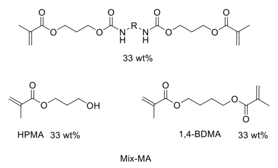 A benchmarked methacrylate monomer blend, “Mix-MA” was used here, the composition of which is presented in Figure 5. This blend has been prepared with 33.3 wt% of (hydroxypropyl)methacrylate (HPMA), 33.3 wt% of 1,4-butanediol dimethacrylate (1,4-BDMA) and 33.3 wt% of a urethane dimethacrylate monomer (UDMA), obtained from Sigma Aldrich (St. Louis, MO, USA). This benchmark blend has an adapted viscosity for polymerization under air [44,61,62,63,64].