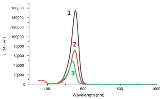 UV-vis absorption spectra of DASA12 (1); DASA11 (2) and DASA9 (3) in acetonitrile.