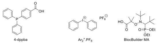 The NIR photoinitiating systems are composed of (NIR) dyes (DASA1–DASA13, PP25 or PP26) combined with an iodonium salt (Ar2I+.PF6), a phosphine (4-dppba) and a thermal initiator (here BlocBuilder MA) (see Figure 7) to take advantage of the photoinitiating system (NIR dye/iodonium/phosphine) associated with the photothermal system (NIR dye/BlocBuilder MA) as presented for other NIR dyes in [64].