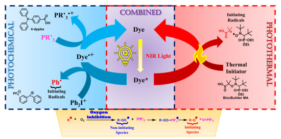 - Bonardi, A.-H.; Bonardi, F.; Noirbent, G.; Dumur, F.; Gigmes, D.; Dietlin, C.; Lalevée, J. Free radical polymerization upon near-infrared light irradiation, merging photochemical and photothermal initiating methods. J. Polym. Sci. 2020, 58, 300–308. [Google Scholar] [CrossRef]