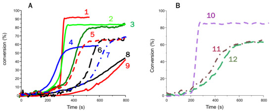 Real Time Fourier Transform Infrared (RT-FTIR) photopolymerization kinetics (C=C conversion vs. irradiation time; 1.4 mm thick sample) under air upon exposure to a Laser Diode@785nm; 2.5 W/cm²; for Mix-MA in the presence of dye/iodonium/4-dppba/BlocBuilder MA(0.1/2/2/2% w/w); the irradiation starts after 15 s for: (A) (1) DASA1; (2) DASA2; (3) DASA3; (4) DASA4; (5) DASA5; (6) DASA12; (7) DASA10; (8) DASA9; (9) DASA11; (B) (10) DASA7; (11) PP25; (12) PP26.