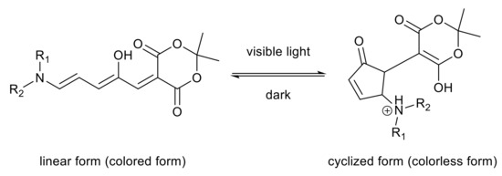 - Minkin, V.I. Photo-, thermo-, solvato-, and electrochromic spiroheterocyclic compounds. Chem. Rev. 2004, 104, 2751–2776. [Google Scholar] [CrossRef]